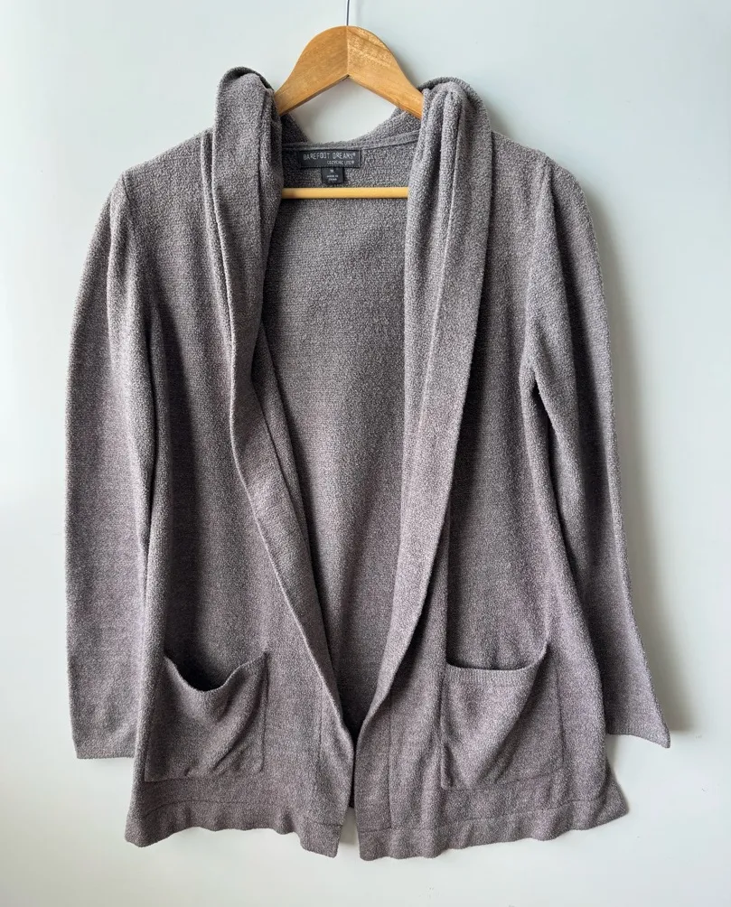 A plush, lightweight knit aces just-right warmth in this longline cardigan that looks great around the house or out on errands. Super soft cozy fabric Open front Hooded Long sleeves Front patch pockets Side slits 75% nylon, 25% rayon Machine washable Gently used Size Medium Chest- 24" Length- 31" Keywords: Barefoot Dreams, CozyChic Lite, Cardigan, Hooded Cardigan, Sweater, Heathered Gray, Open Front, Pockets, Relaxed Fit, Soft, Comfortable, Loungewear, Casual, Medium