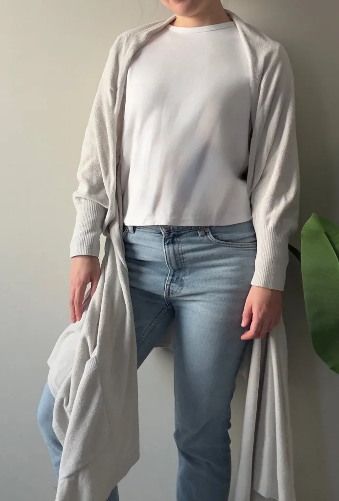 Stylish long cardigan. Perfect for layering. Condition: Good pre-owned condition with a few blue-gr... Show more