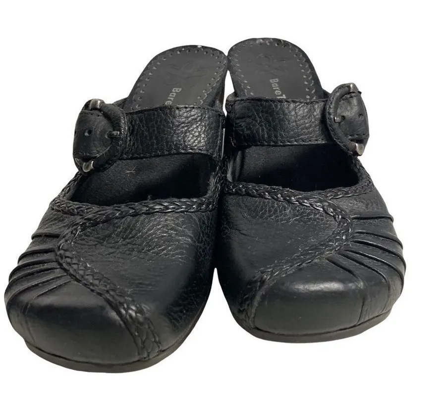 BARE TRAPS, Mary Jane shoes, Ginger Style, Black, Leather Upper, wedge heel, leather upper balance man made materials. Adjustable straps. A few scratches on the heels. See picture. Please see approximate measurements in pictures before purchasing. Use your own judgment as to the fit. Dainty, fashionable, dressy.