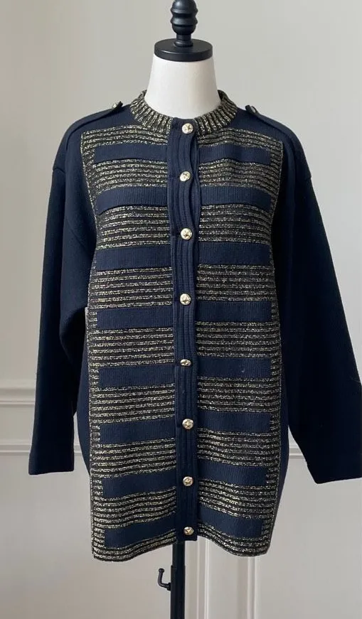 Barra of Italy navy blue military style, button Cardigan with Shoulder epaulettes, gold, metallic, threading, and gold buttons with a star in the center. On seam hip pockets. And 89% wool and 11% other fibers which I believe is the metallic threading. No size however it is featured on my size medium dress form for scale where it fits well without pulling too much in the bust area. Could also fit a large or maybe even an XL if you wear open, but double check measurements to ensure the proper fit for you, 29 inches shoulder to ham and 23 inches armpit to armpit.