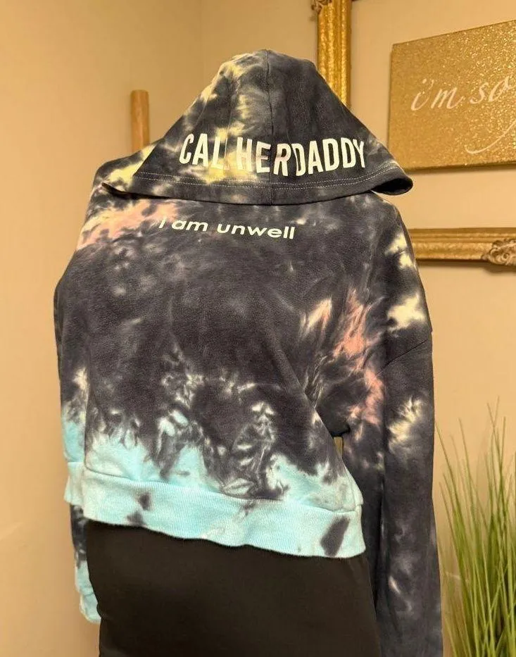 Like new condition! Not much to say here you know what it is! Stylish tie-dye cropped hoodie with 'Call Her Daddy' and 'I am unwell' text. Features a blend of dark and light colors.