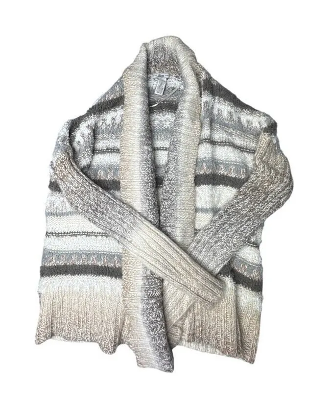 Stay cozy and stylish with this beautiful Bass cardigan, size medium. Crafted from a luxurious wool and alpaca blend, this soft and warm knit features a mix of neutral earth tones—beige, taupe, grey, brown, and creamy white—in a subtle horizontal stripe pattern. The thick ribbed shawl collar and cuffs add extra warmth and a rustic-chic vibe.