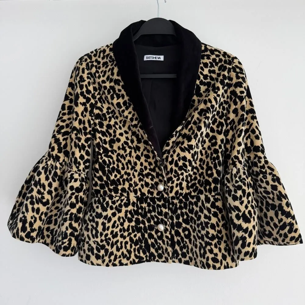 Batsheva Jacket Womens 2 Leopard Animal Print Bell Sleeves Velvet Artsy Cropped It is missing the first button - otherwise pristine condition Description * Batsheva Jacket * Black * Animal Print * Stand Collar * Button Closure * Estimated item measurements * Bust: 32.5" * Waist: 27.75" * Shoulder: 15.75" * Length: 21.25" * Sleeve: 18"
