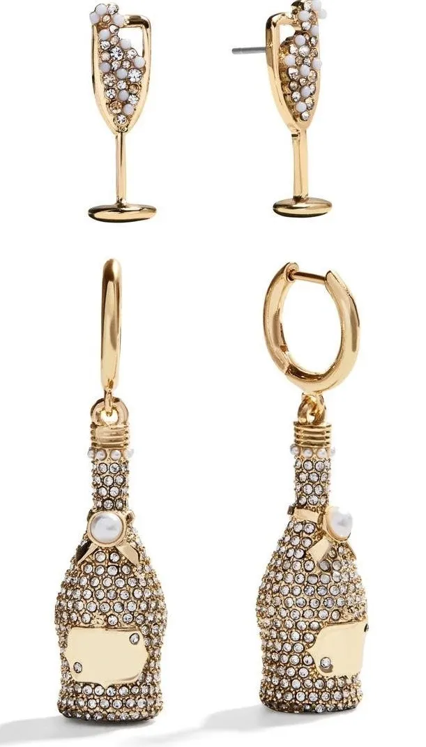 Crystals and faux-pearls serve up effervescent style on champagne-bottle hoop earrings paired with f... Show more