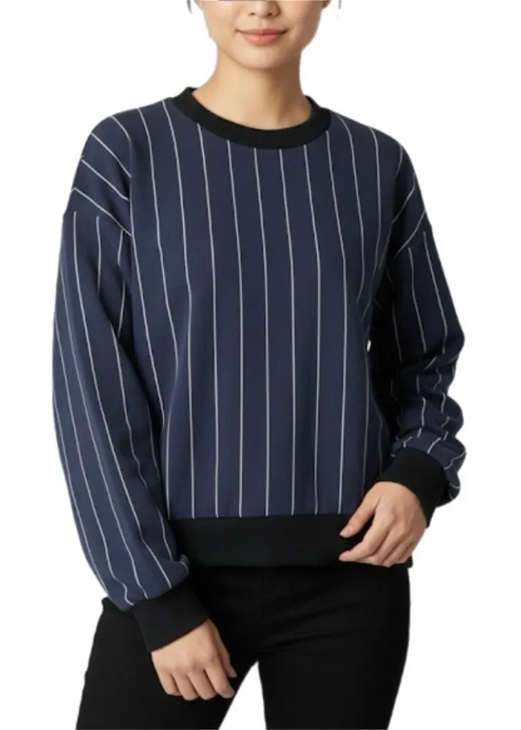 Baum Und Pferdgarten Jannet Sweatshirt Top in Navy Cream Pinstripe. Good used condition with light mark near neck hem and pinhole. Size Large. Chest - 22" Length - 22" This crewneck top features a comfortable ribbed collar, cuffs, and hem, offering a relaxed yet stylish silhouette. Its versatile design makes it perfect for casual outings, layering during cooler months, or adding a touch of sporty chic to your everyday wardrobe. Material: 85% Viscose, 13% Polyester, 2% Elastane Pinstripe sweatshirt, crewneck top, long sleeve, casual wear, sporty chic, striped knit, relaxed fit, street style, everyday essential, layering piece, modern classic SKU 81825