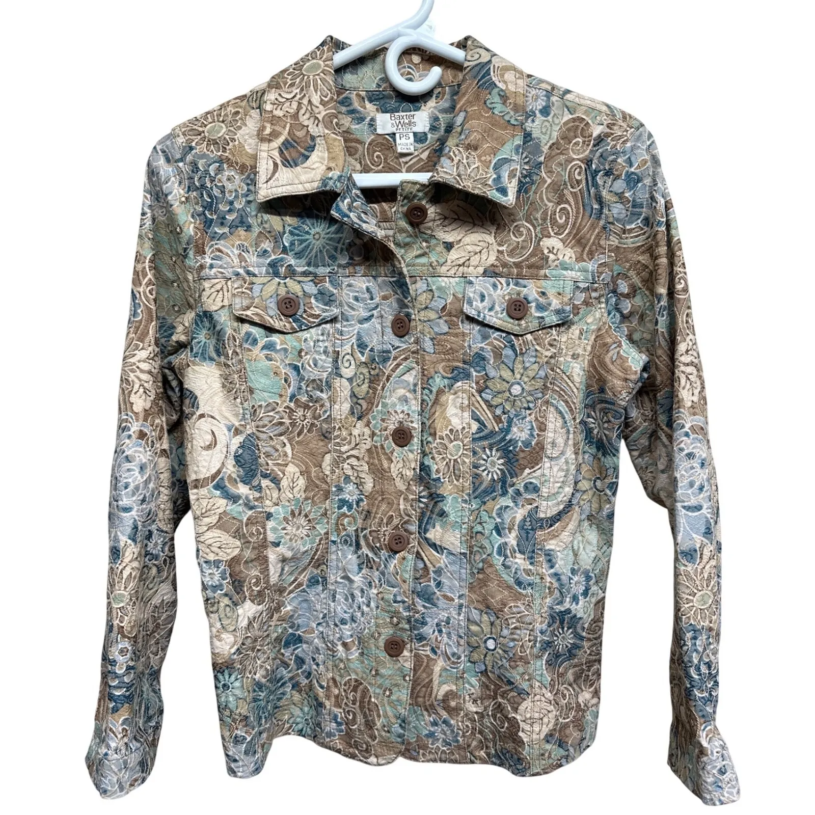 Baxter & Wells petite women's denim jacket showcasing a captivating allover floral print. This stylish jacket features a classic collared neckline, button-front closure, and dual chest pockets. Its unique tapestry-like fabric adds a touch of sophistication, making it perfect for a casual outing or a creative brunch. Type: Jacket Outer Shell Material: Cotton Style: Basic Jacket Department: Women Theme: Flower Accents: Button, Embroidered Features: Collared, Stretch Pattern: Floral Season: Spring, Fall Closure: Button Occasion: Casual Sleeve Length: Long Sleeve Fit: Regular Garment Care: Care on reverse Country of Origin: China Keywords: Baxter Wells, petite jacket, floral pattern, tapestry fabric, button front, collared jacket, women's outerwear, spring fashion, fall wardrobe, casual style, printed denim, unique print, boho chic, everyday wear