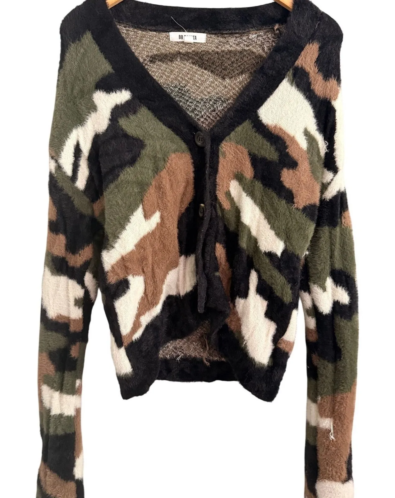 Keywords: BB Dakota, fuzzy sweater, camo print, knit cardigan, army green, cozy knit, V-neck, button up, fall fashion, winter style, casual wear, statement piece, plush texture, outerwear