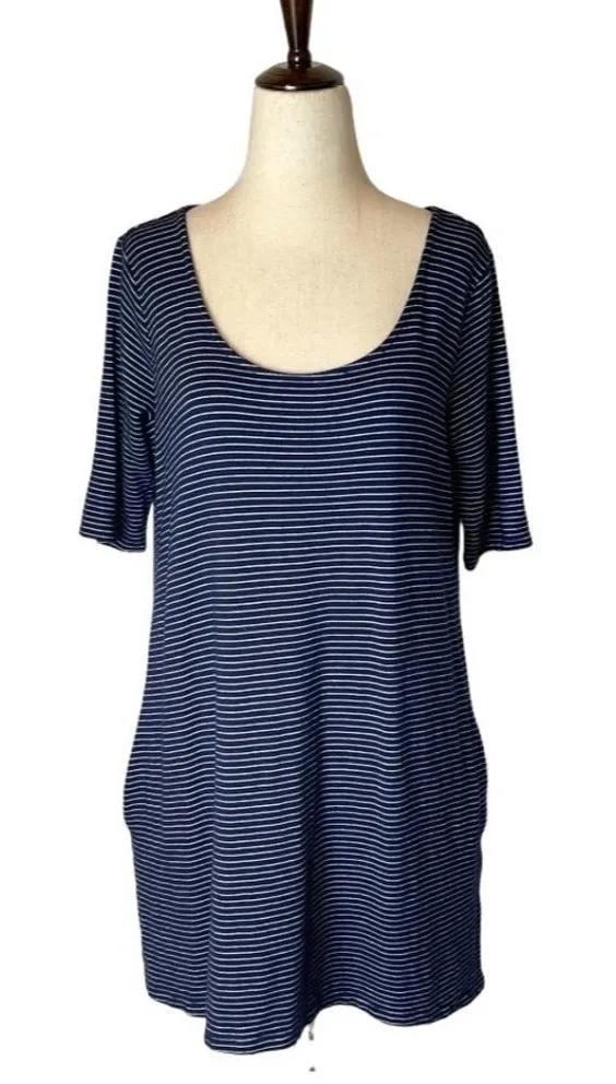 This tunic dress from BB Dakota is in excellent condition. It is in a striped print all over in navy blue and white colors. It features a scoop neckline, elbow-length sleeves, side slash pockets, tunic length, and is in a pullover style. It is made with rayon and polyester material in jersey fabric that is lightweight and comfortable with lots of stretch.