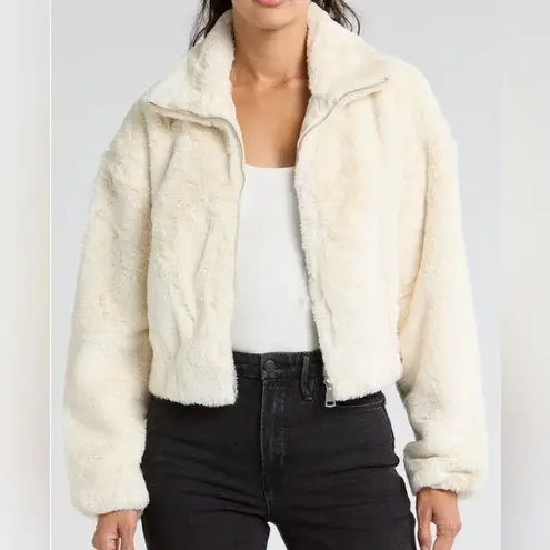 Layer on this supersoft faux-fur bomber jacket fashioned in a slouchy, cropped silhouette and finish... Show more