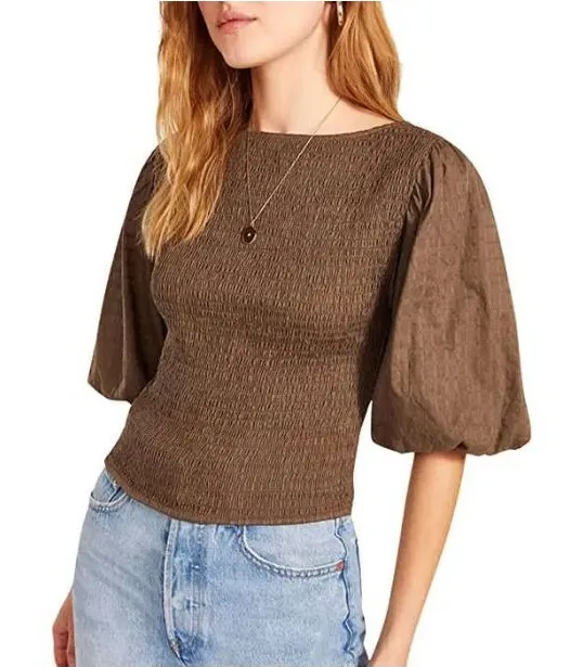 Embrace stylish comfort with this BB Dakota Steve Madden smocked crop top. The richly textured smocking creates a flattering silhouette that contours your curves, while the voluminous puff sleeves add a playful touch of drama. Its versatile brown shade makes it a perfect base piece for countless outfits, effortlessly swapping from a casual brunch to a night out. Style it with high-waisted jeans for a relaxed vibe or pair it with a skirt for a more refined look. - Excellent Pre-Loved Condition - No notable signs of discoloration or flaws - 100% Cotton Approximate Measurements Lying Flat Pit To Pit: 13.5" Length: 18" Sleeve Length: 13" Keywords: smocked, puff sleeve, crop top, BB Dakota, Steve Madden, brown, cotton, casual, trendy, feminine, statement sleeve, textured