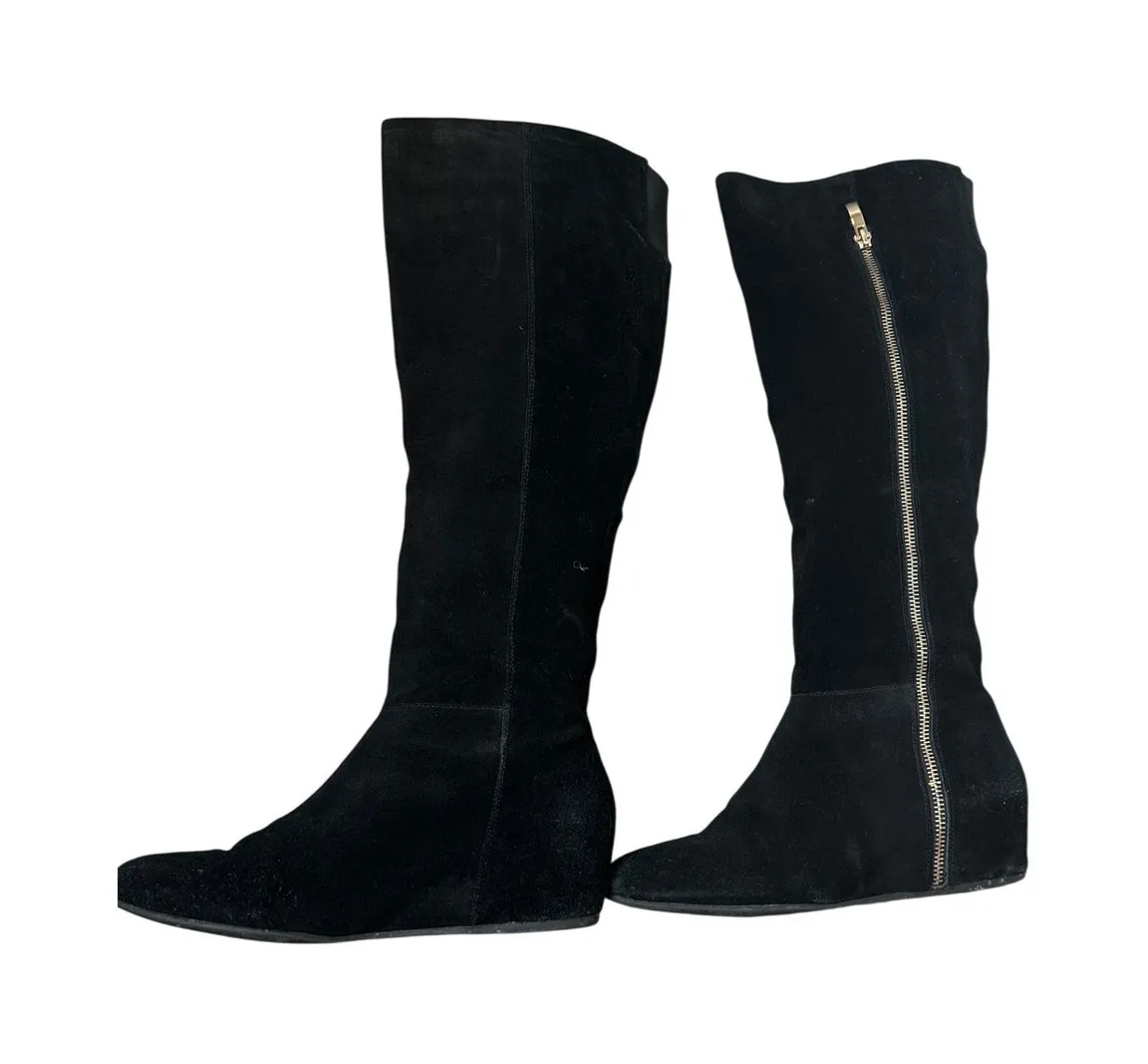 Black suede wedge knee-high boots. These boots feature a convenient side zipper for easy on and off... Show more