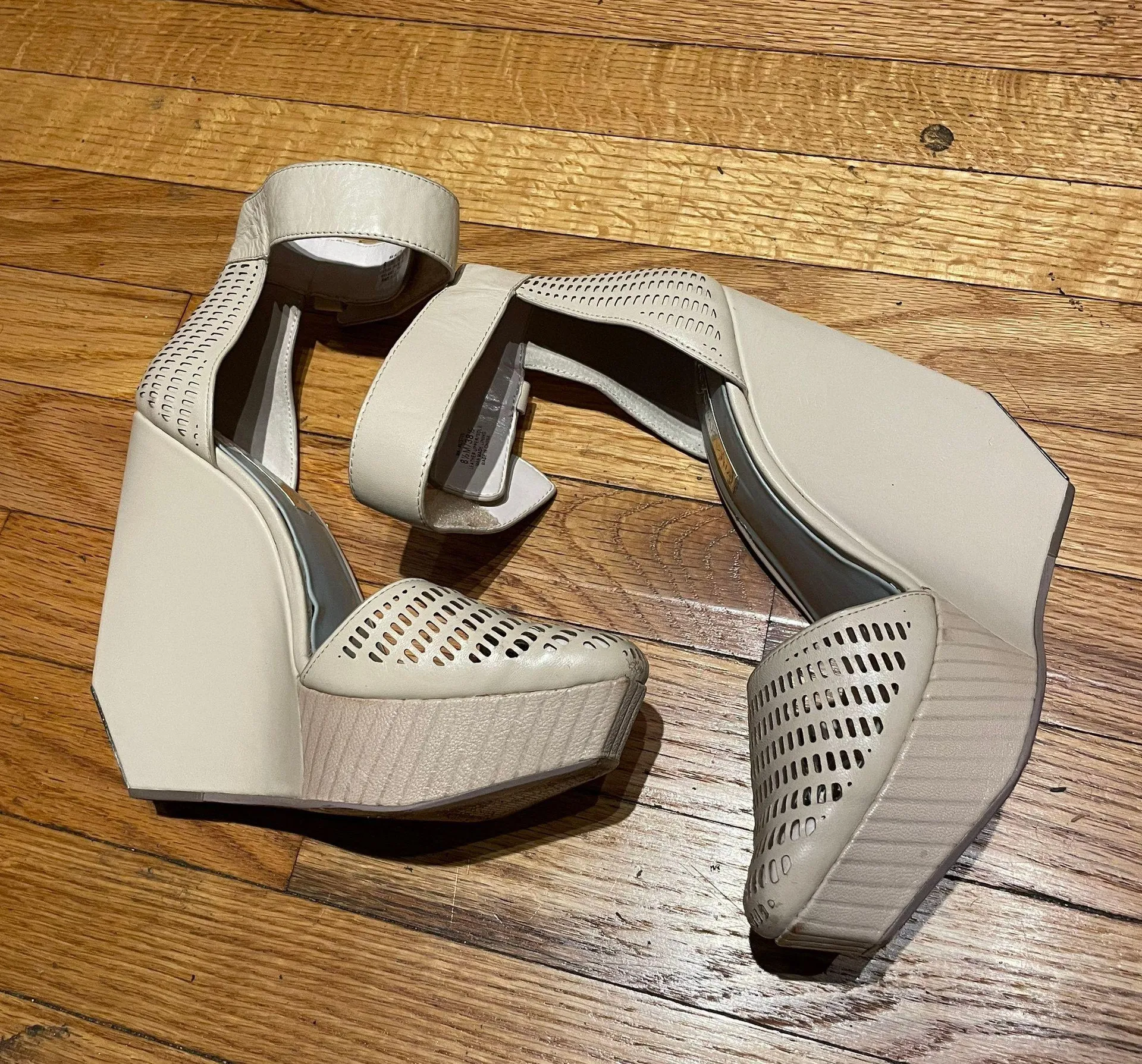Austin Wedges BcBgMaxAzria High Heels 4” Leather Perforated Laser cutouts Ankle velcro strap closure... Show more