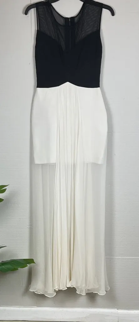 This elegant sleeveless dress features a classic black bodice and a flowing white skirt. Perfect for... Show more