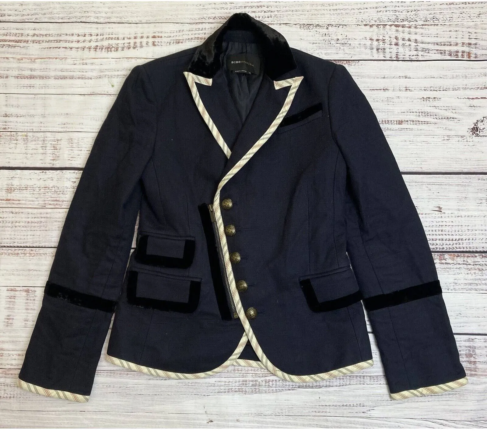 BCBG Maxazria Military Officer Blazer Coat Button Zip Velvet Trim Navy Blue XS. Chest: 18” across... Show more