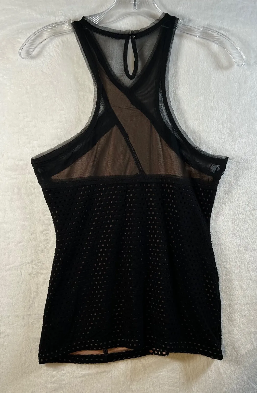 BCBGMAXAZRIA black mesh halter tank top. This sleeveless top features a striking sheer mesh overlay... Show more