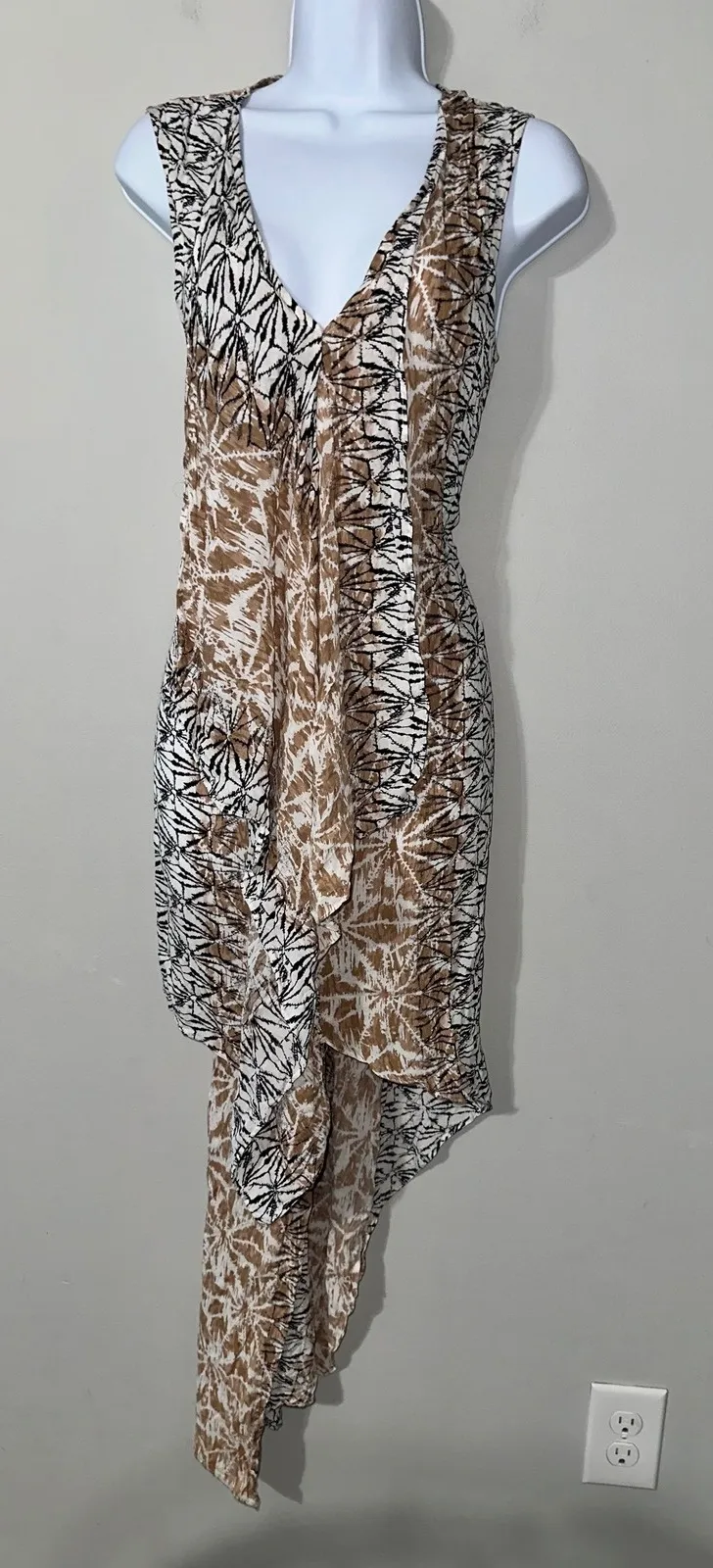 Keywords: BCBGMAXAZRIA dress, asymmetrical dress, sleeveless dress, brown dress, black dress, white dress, printed dress, flowy dress, handkerchief hem, v-neck dress, contemporary dress, modern dress, womens dress