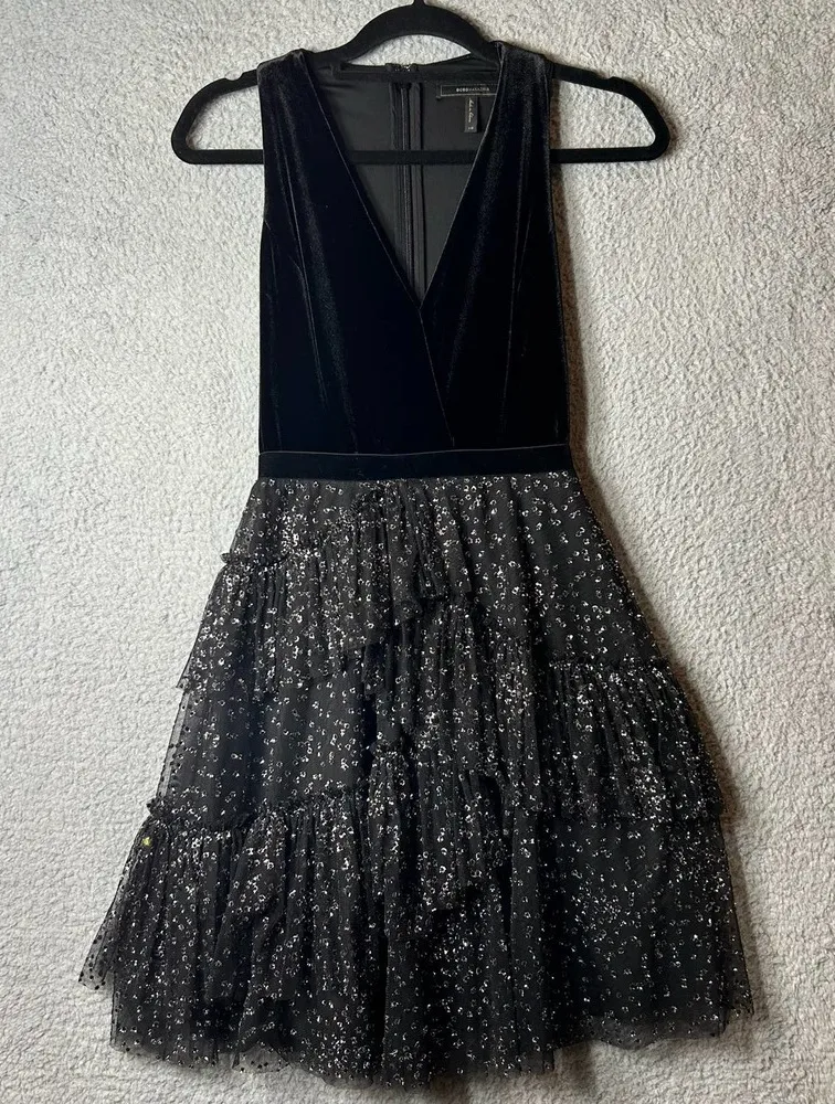 BCBGMAXAZRIA Dress Womens XS Black Plunging Velvet Metallic Tulle Holiday Party Retail: $328 Featur... Show more