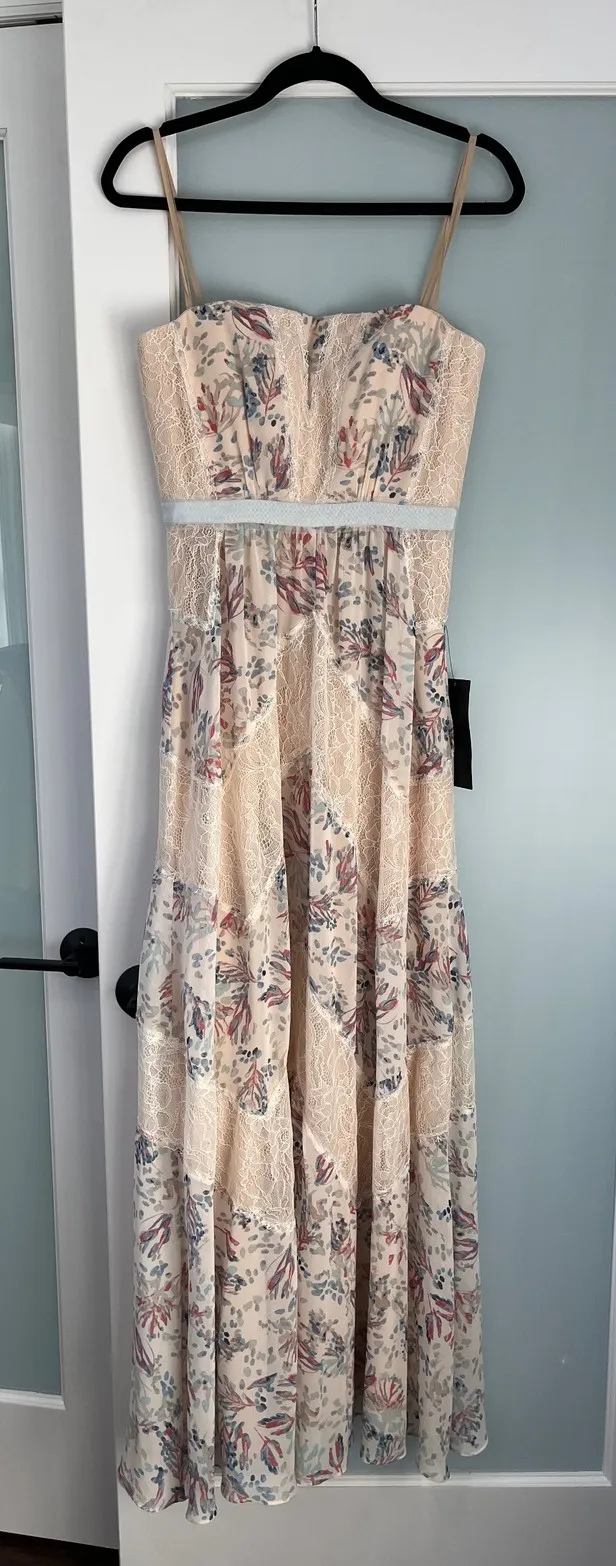 Elegant formal gown featuring a delicate floral print on a soft beige background with intricate lace... Show more