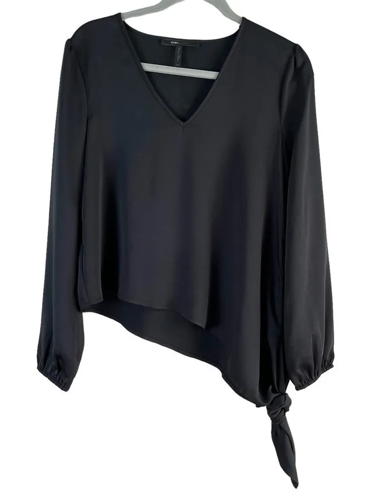 BCBGMAXAZRIA V-Neck Asymmetric Hem Side-Tie Long Sleeve Blouse in Black, Size XS Features: V neckli... Show more