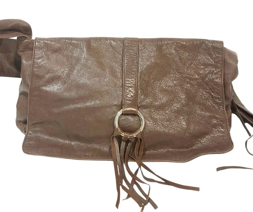 VINTAGE 2000S BCBG Maxazria BROWN LEATHER SHOULDER Crossbody BAG FRINGE 17” Wide x 9” Deep Excellen... Show more