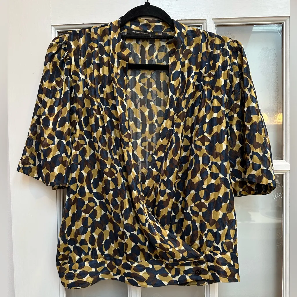 Elevate your wardrobe with this chic patterned top. Featuring a blend of black, blue, and tan colors... Show more