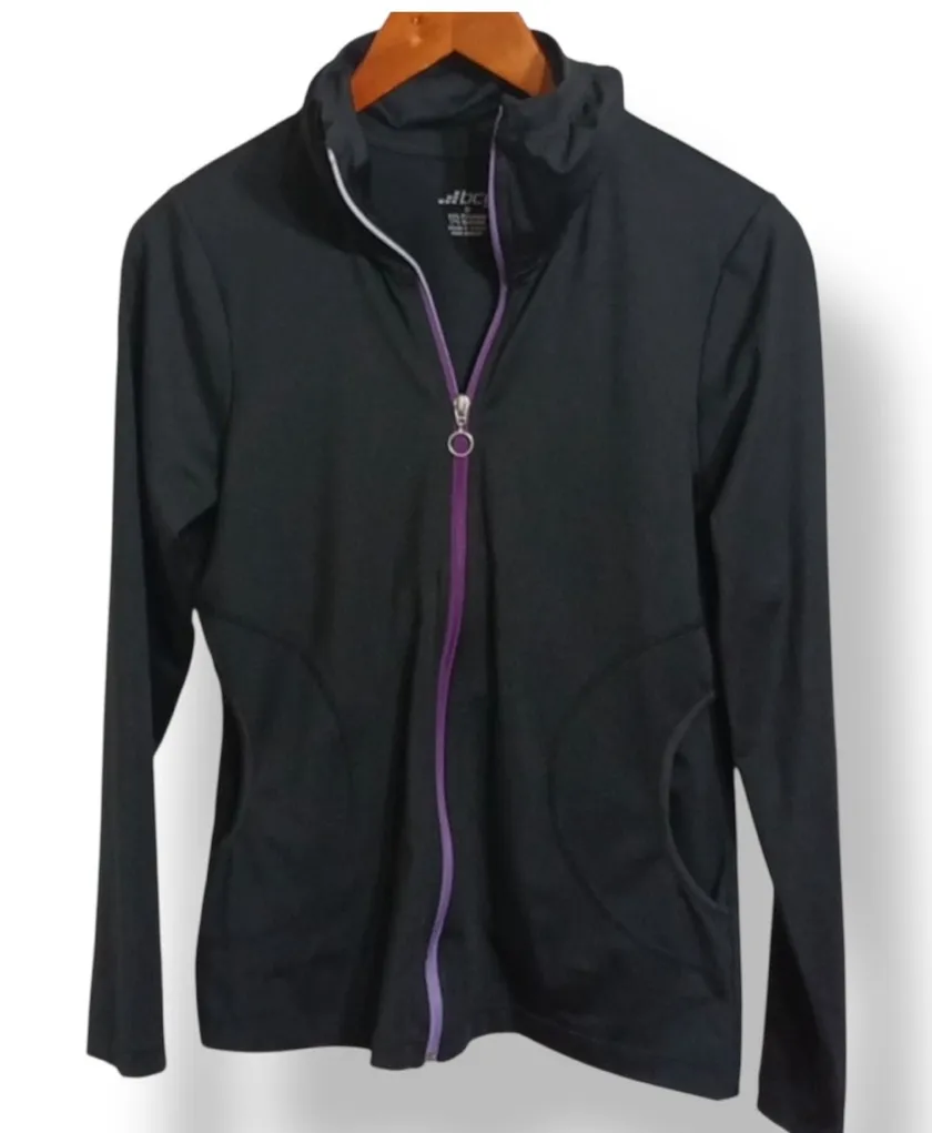 Keep your workouts comfortable with this BCG Full-Zip Athletic Jacket in classic black with a pop of purple contrast trim. Designed with lightweight performance fabric, it offers stretch, breathability, and easy layering for walks, workouts, errands, or casual wear. Features: • Full-zip front with purple contrast zipper • Lightweight, stretchy performance fabric • Stand collar / funnel neck • Curved seam detailing for a flattering fit • Two front pockets • Long sleeves • Women’s Size S Condition: Excellent pre-owned condition — no flaws noted. Please see pics as they are part of my description. Pics are of the actual item you will receive. Clean and Smoke Free Home One small dog that is NOT allowed and cannot access this area but there could be some hair transfer. Thanks for looking!