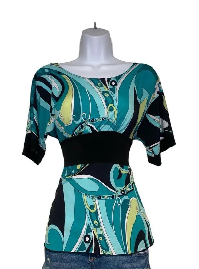 Y2k blue, black and green psychedelic babydoll blouse with flowy short sleeves Blue Size M - $29 - From Gianna