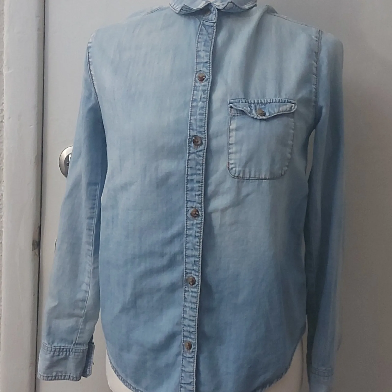 Style: Button Up Color: Light Blue Wash Size: XS Armpit: 16" Length: 26 Condition: Good, two spots o... Show more