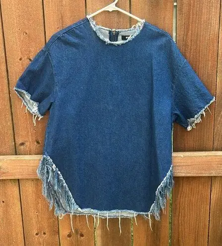 Short sleeve denim top, frayed collar and cuffs, side slit with fringe hem, upper back zipper close... Show more