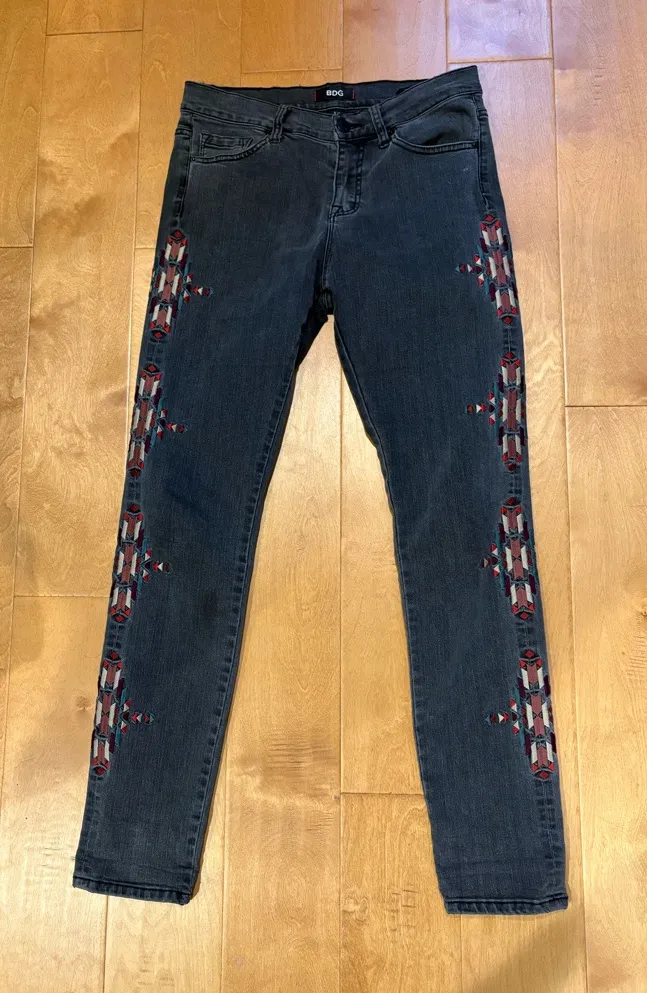 BDG High Rise Cigarette Ankle Denim Jeans with Aztec tribal embroidery. Size 29 w 30l. Pretty good... Show more