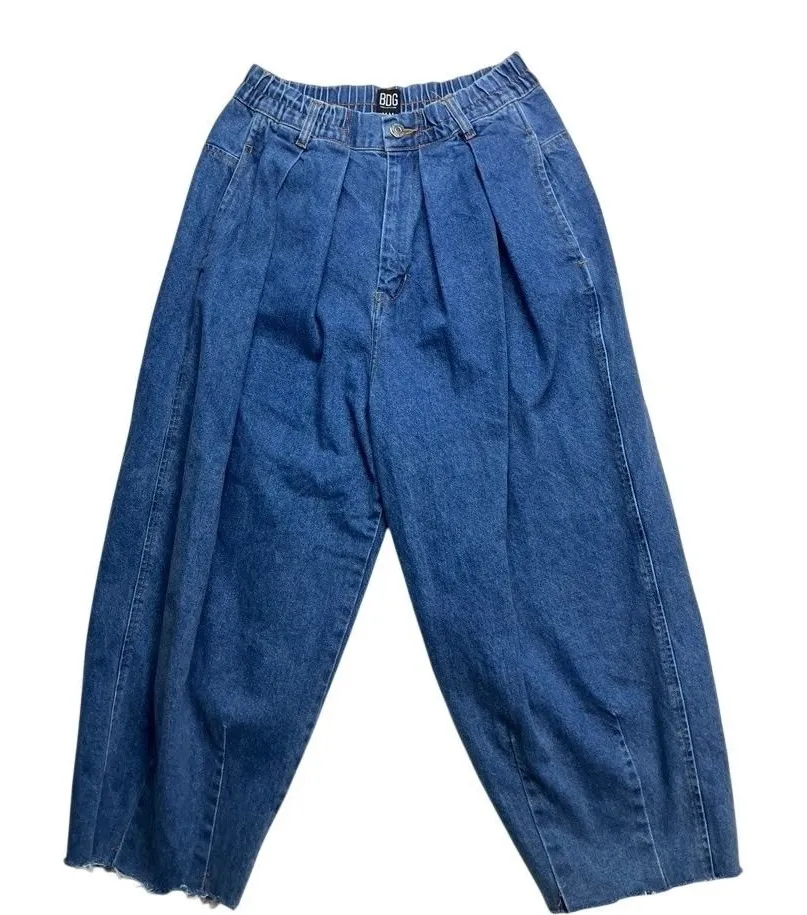 Measurements: • Waist: 26 in (elasticized) • Inseam: 20 in • Rise: 14 in Style: Wide-Leg Department: Women Fabric Wash: Medium Waist Size: 30 in Type: Jeans Accents: Pleated, Fringe Features: Elastic Waist, Adjustable Waist, Pockets Fit: Relaxed Pattern: Solid Rise: Mid (8.5-10.5 in) Fabric Type: Denim Material: 100% Cotton Closure: Drawstring, Button Season: Spring, Summer, Fall Keywords: wide leg, pleated, cropped, denim, jeans, high rise, distressed hem, casual, streetwear, mom jeans, relaxed fit, baggy, summer, spring Ships fast from a smoke and pet free home.