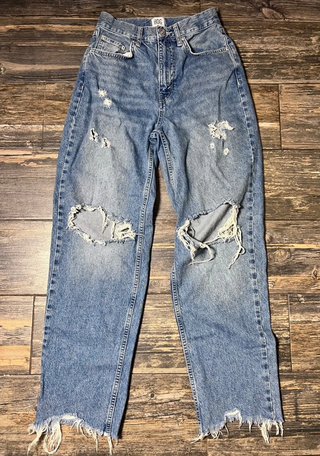 Keywords: BDG jeans, Urban Outfitters, High-rise jeans, Baggy jeans, Ripped jeans, Distressed jeans, Size 26, Light wash jeans, Denim, Frayed hem jeans, Casual jeans, Vintage style jeans, Womens jeans, Cotton jeans