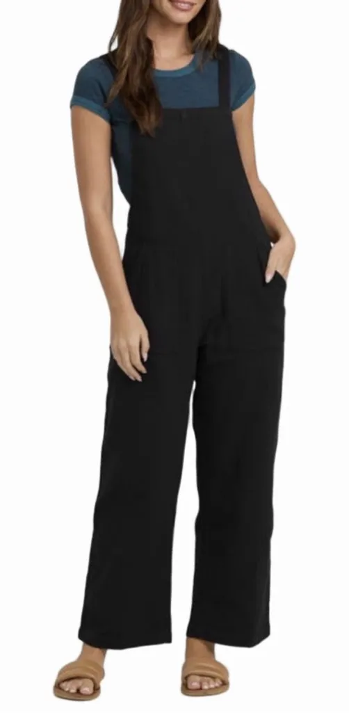 Tapered leg baggy overalls/jumpsuit in black linen blend. Sleeveless with square neck. Pockets. Cr... Show more