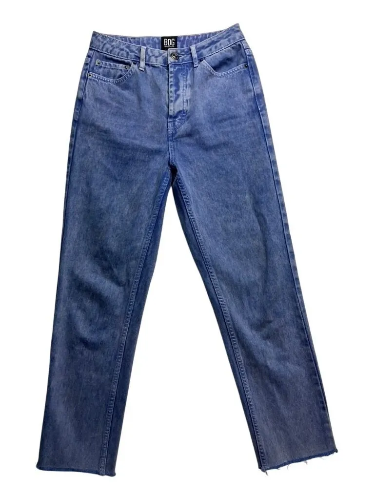 Style: Straight Department: Women Fabric Wash: Acid Wash Waist Size: 25 in Type: Jeans Accents: Studded, Logo, Button Features: Pockets, Distressed, Stretch Fit: Slim Pattern: Solid Rise: High (Greater than 10.5 in) Fabric Type: Denim Inseam: 32 in Material: 100% Cotton Closure: Button Theme: Logo, Hipster Keywords: BDG, jeans, denim, slim straight, blue wash, high rise, distressed hem, streetwear, casual, everyday, modern, trendy, cotton, made in Turkey Ships fast from a smoke and pet free home.