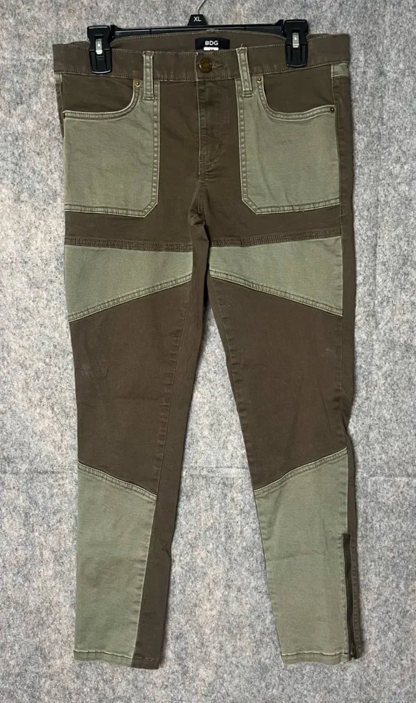 BDG Moto Ankle Zip Skinny Pants from Urban Outfitters in olive green patchwork. In good pre owned co... Show more