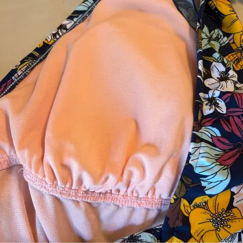 Beach Betty slimming control V neck floral one piece in multicolored vintage inspired floral print. V neckline with plunge back secured with tie. Flirty flutter sleeves for an added feminine touch. Excellent preowned condition, does have small picked area on inner lining. Hygienic liner is removed, removable cups in place. Photos are of actual item so please view each one for description and cosmetic detail. Tag photos included. Beach, pool, cruise, resort wear, vacation, summer, bathing suit, swimming, floral, ruffle, bow, v neck, slimming