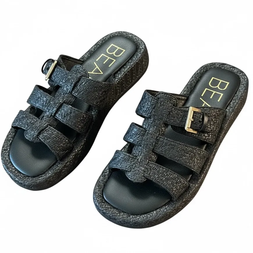 Step into summer with these Beach by Matisse Ciao Raffia Fisherman Slides in versatile Black. In Excellent Used Condition (EUC), these sandals feature a modern take on the classic fisherman silhouette with a breezy, woven texture. Aesthetic & Style: These slides are the ultimate accessory for the Coastal Grandmother and Boho-Chic aesthetics. The natural raffia construction paired with the structured black weave makes them perfect for pairing with linen trousers, sun dresses, or your favorite swimwear for an effortless vacation look. Product Details: Brand: Beach by Matisse Size: Women's 9 Condition: Excellent Used Condition (EUC); minimal wear to the soles, raffia is intact and well-shaped. Color/Fabric: Black woven raffia upper; synthetic lining and outsole. Key Features: Slide-on style for easy wear, a stylish fisherman-inspired cage design, and a lightly padded insole for all-day comfort.