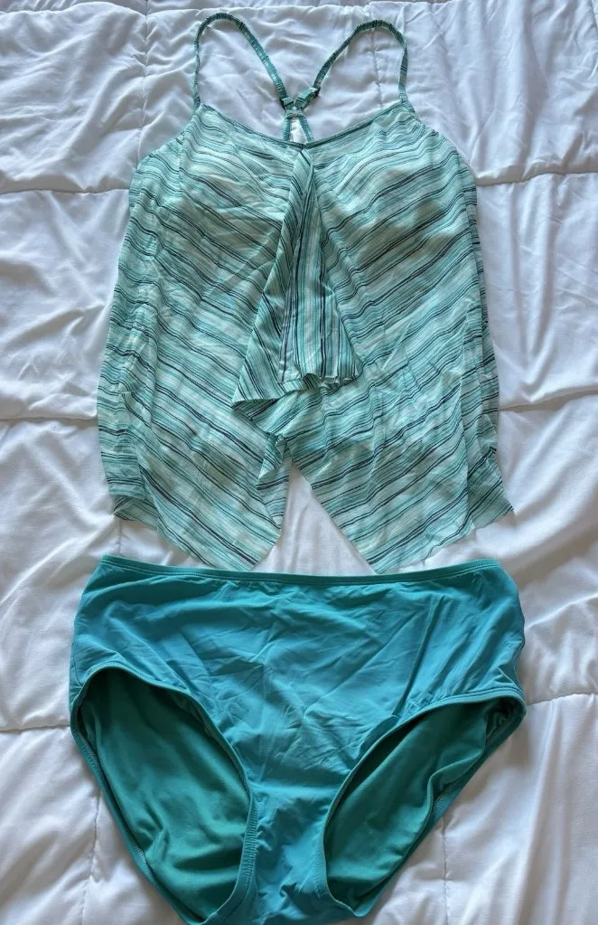 The BEACH HOUSE Women's Size 14 Racerback Tankini Swimsuit Top in blue features a stylish tankini top with a striped pattern and ruffle accents. Very good preowned condition besides pulling on the bikini bottom. Otherwise excellent condition! Tags: swim, beach, summer, nautical, tropical, vacation, resortwear