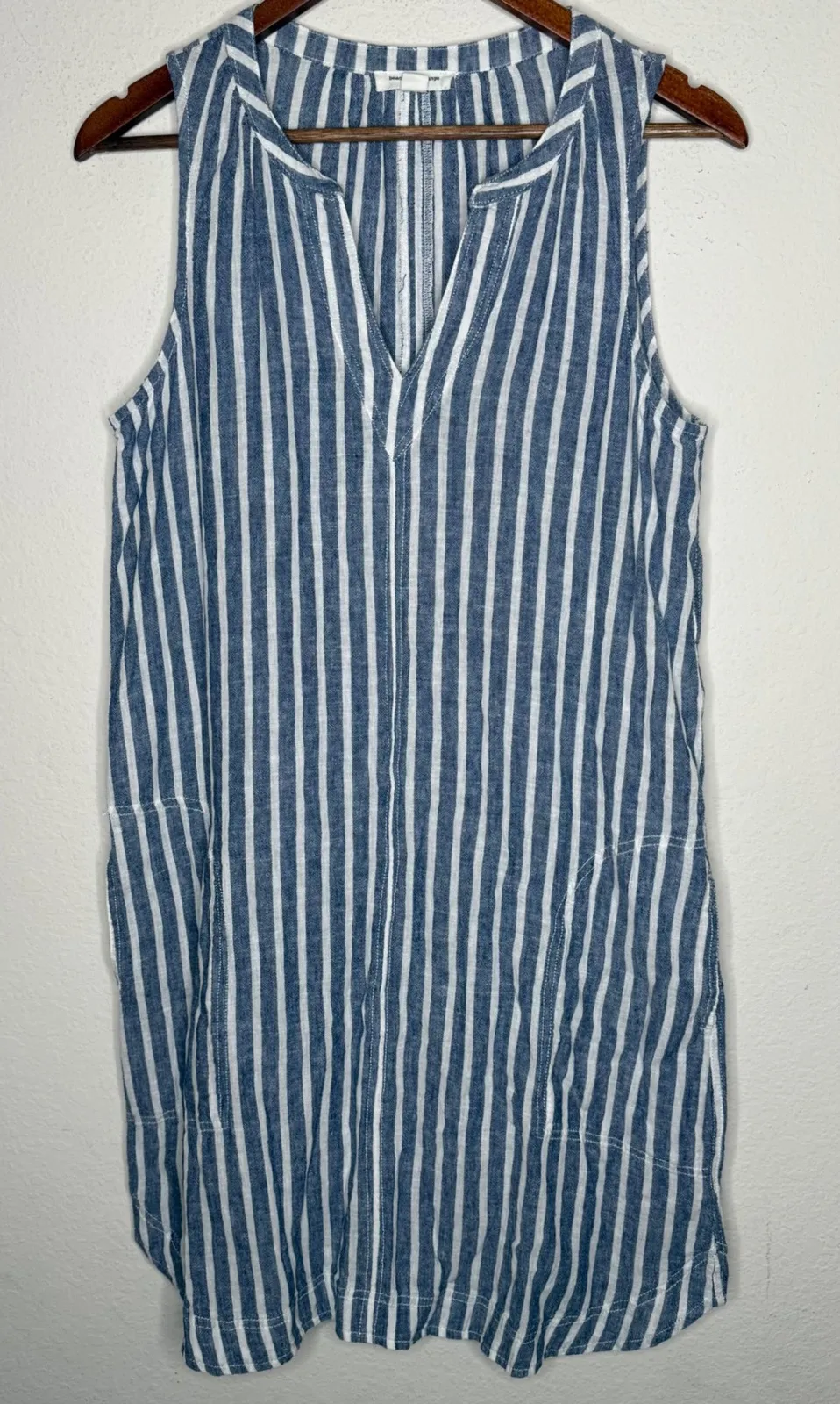 Embrace effortless summer style with this charming Beach Lunch Lounge shift dress. The breathable linen-cotton blend drapes beautifully, offering a comfortable and airy feel perfect for warm days. Vertical blue and white stripes create a flattering silhouette, while the V-neckline and sleeveless design exude a casual yet chic vibe. Functional pockets add a touch of practicality to this versatile piece. Approximate measurements Across front 20" Length 37" Style: Shift Dress Length: Midi Sleeve Length: Sleeveless Pattern: Striped Occasion: Casual, Travel Material: Linen, Cotton Blend Fabric Type: Woven Neckline: V-Neck Season: Summer, Spring Sleeve Type: Sleeveless Closure: Pullover Keywords: Beach Lunch Lounge dress, blue white stripe dress, sleeveless dress, linen cotton blend dress, V neck dress, shift dress, midi dress, women's casual dress, summer dress