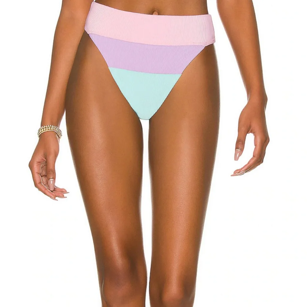 Brand new with tags! Never worn! There is some VERY slight rubbing on the back shown in the last picture. Very hard to see and not noticeable. Size: XS Color: Pastel Color Block - Pink, Purple, Light Blue 80% nylon, 20% lycra. Made in USA. Hand wash. Ribbed fabric. Revolve Style No. BRIO-WX917 Manufacturer Style No. BR09224R1.