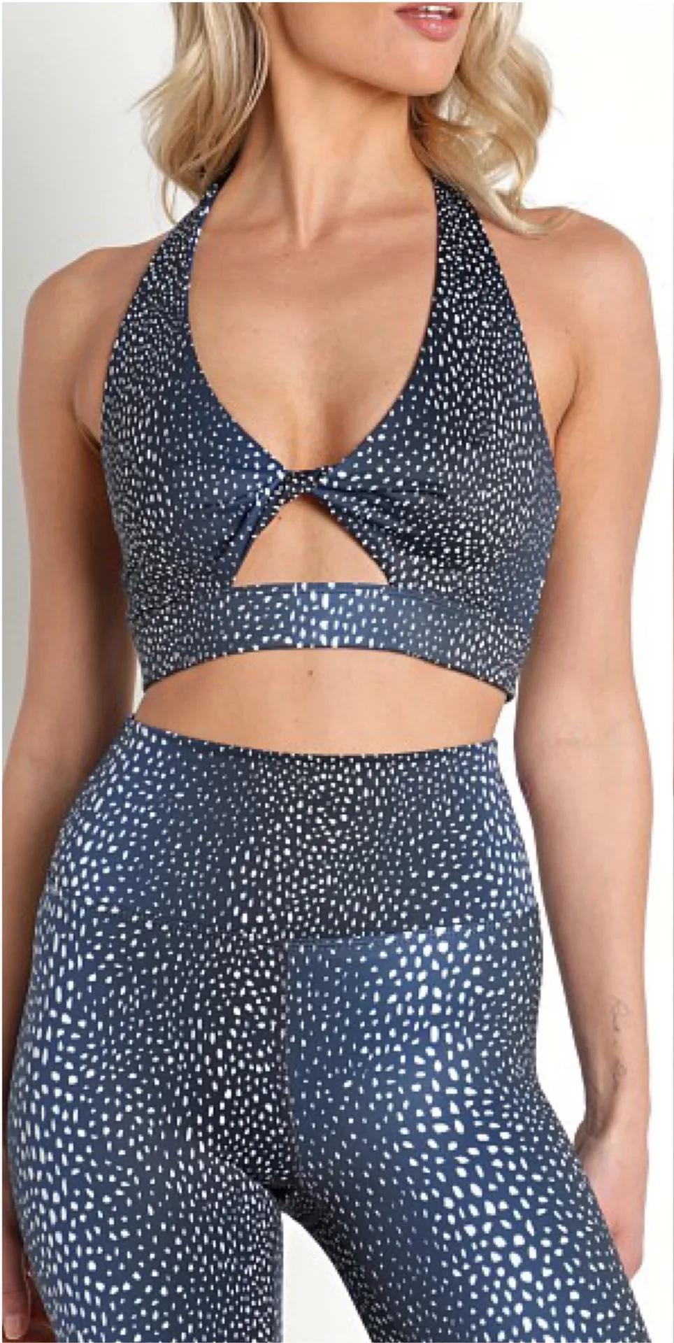 Beach Riot Bra Twist Top Sports Bra Racerback Navy Splatter Sz L NWT New Size L 75% polyester, 25% spandex Hand wash New with tags “A sport bra with a twist, featured in navy splatter. It has a racerback and front twist with an open band allowing your skin to peek through.” Check pictures for approximate measurements, open to offers! Tags: athletic, gym, sporty