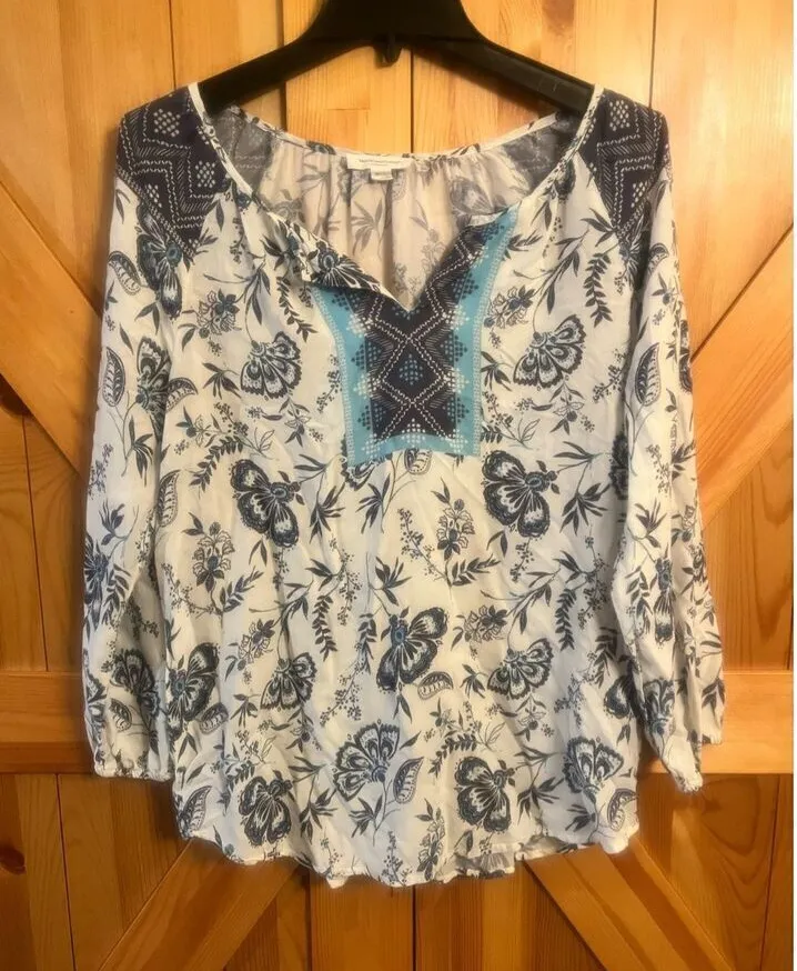Beach Lunch Lounge Top Womens Small white Blue Floral Long Sleeve V-Neck Blouse pit to pit 21” lengt... Show more