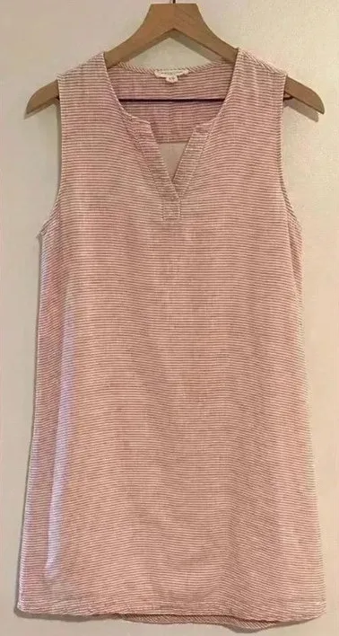 - 55% linen, 45% cotton - lined dress - v neck style - striped design - preowned, good used condition - hole on hem on back of dress as shown in picture approximate measurements taken lying flat - bust 18" - waist 18 1/2" - length 33" - OPEN TO OFFERS - - BUNDLE & SAVE -