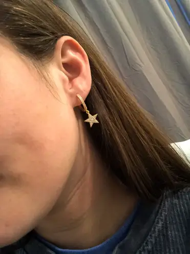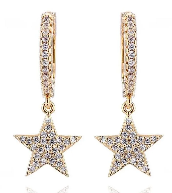 30mm drop star earrings. Cubic zirconia star charm dangles off of small gold pave hoops.