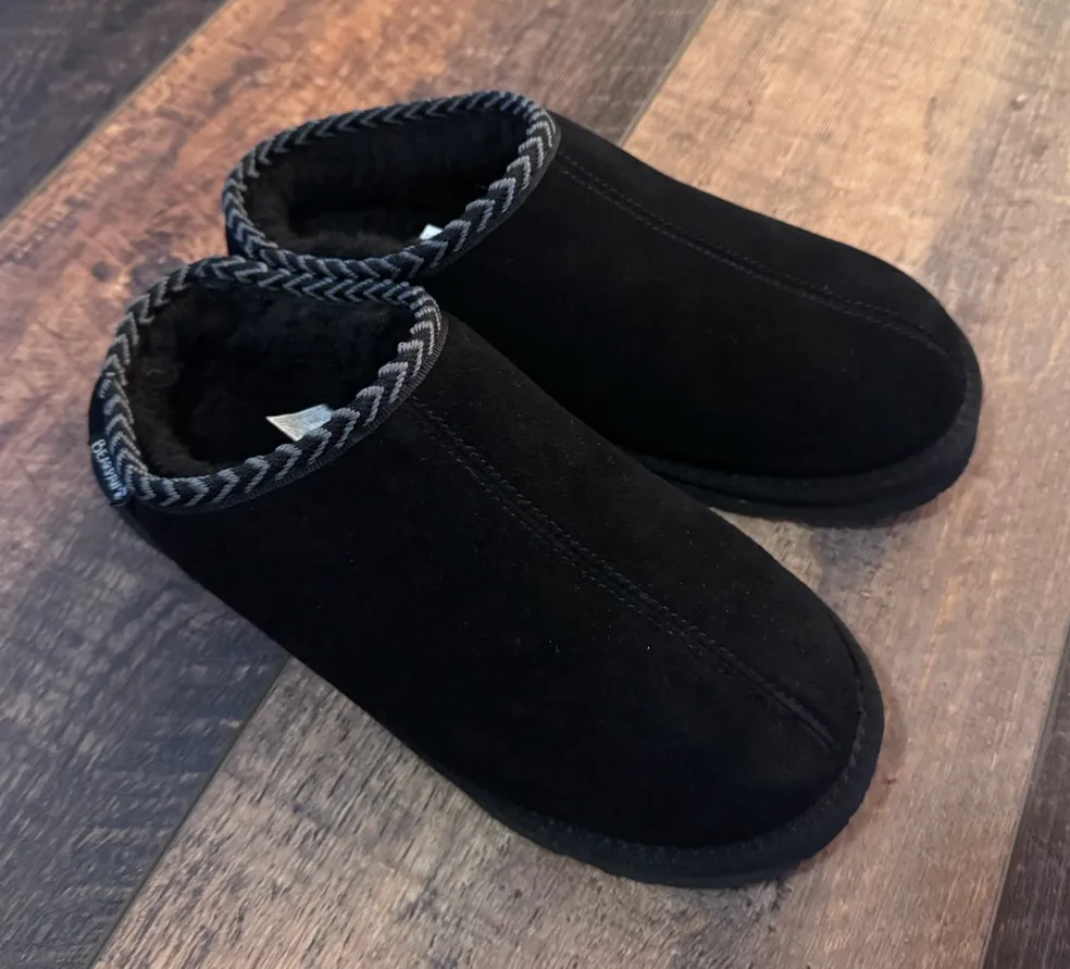 Cozy Bearpaw women’s slippers featuring a soft black suede upper and plush faux fur lining for warmt... Show more