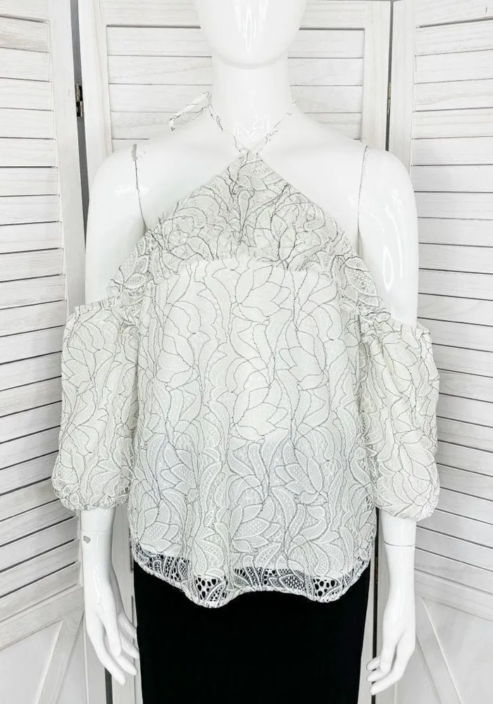 Beau Tissu Lace Cold Shoulder Puff Sleeve Halter Blouse Size Small White floral lace Black outl... Show more