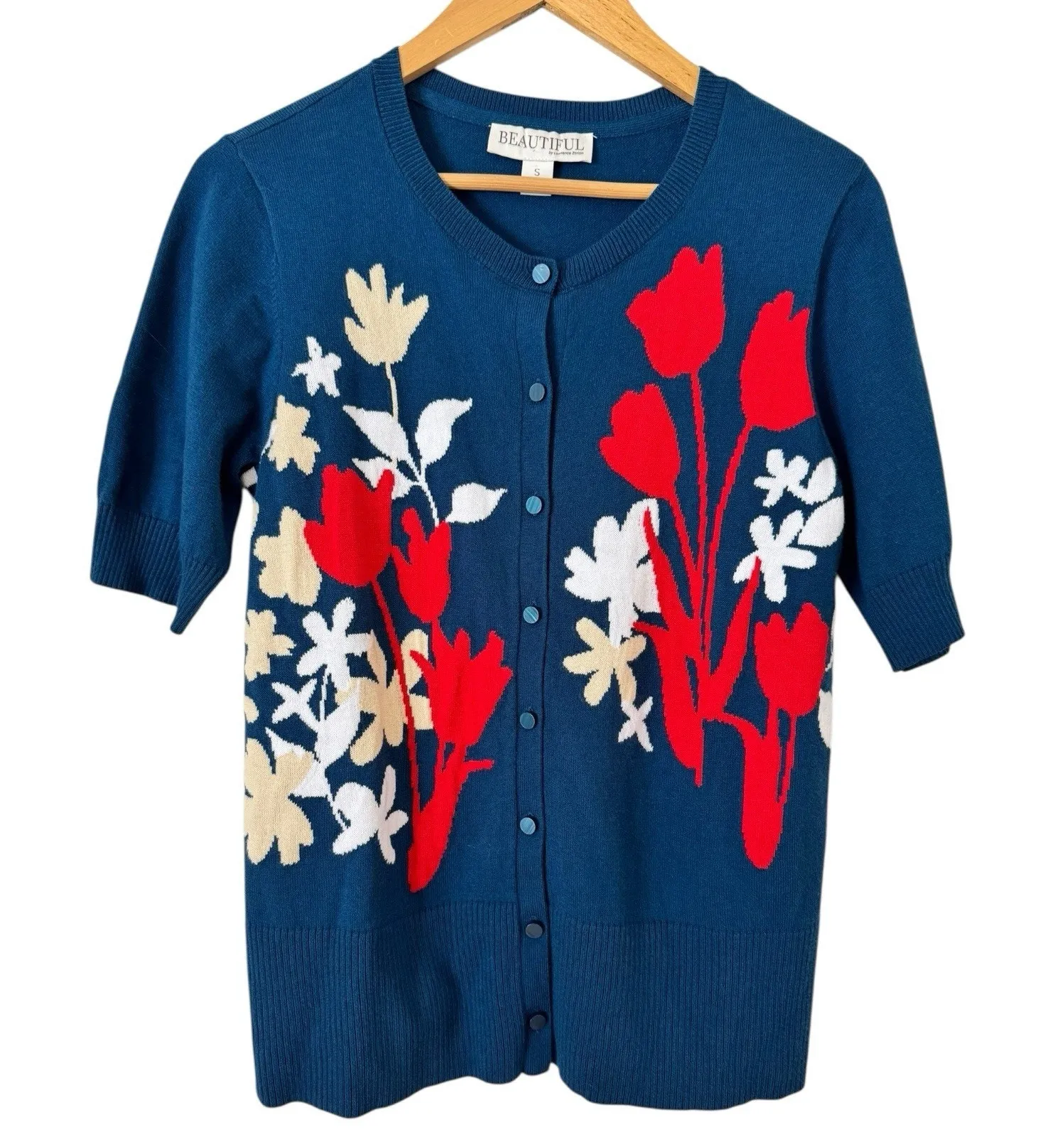 Beautiful By Lawrence Zarian Floral Short Sleeve Button Front Cardigan Sweater. Lightweight knit with some stretch. Ribbed hem and cuffs. Women’s size small Excellent condition no rips, holes or stains! Measurements Chest 17.5” Waist 17.5” Length 24” Measurements are approximate and taken while laid flat.