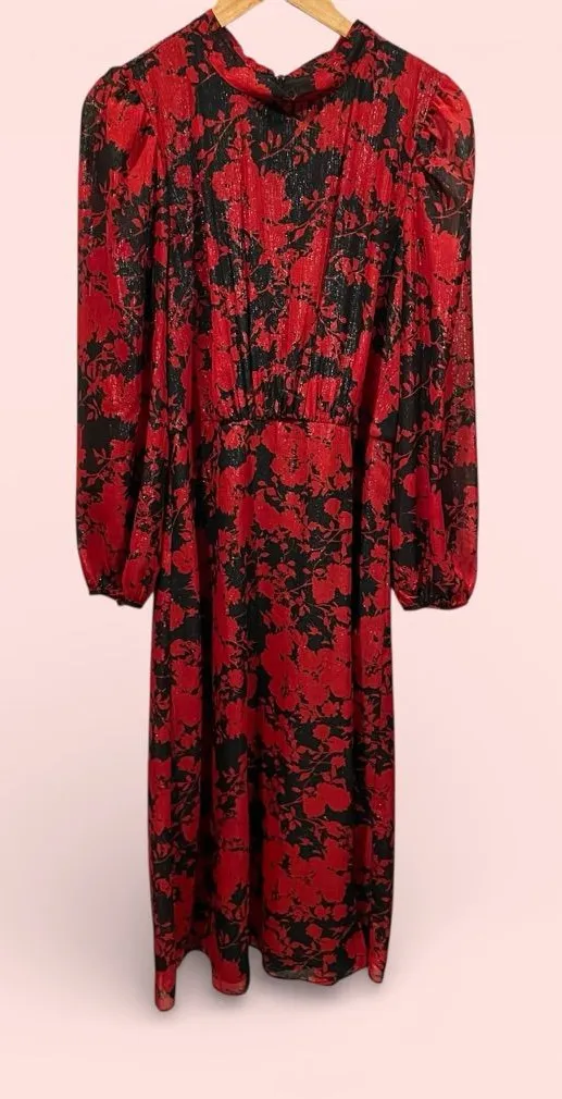 . GUC. Size 10. Back zipper closure. Neck tie can be tied in the front or the back. (Tied in the back for the photo) Lovely drape. Dress is lined but the sleeves are sheer. Small leg slit. Flowy. Measurement taken laying flat are approximately: Pit to pit: 20” Waist: 16” Hip: 21.5” Length: 49” Sleeve: 26”