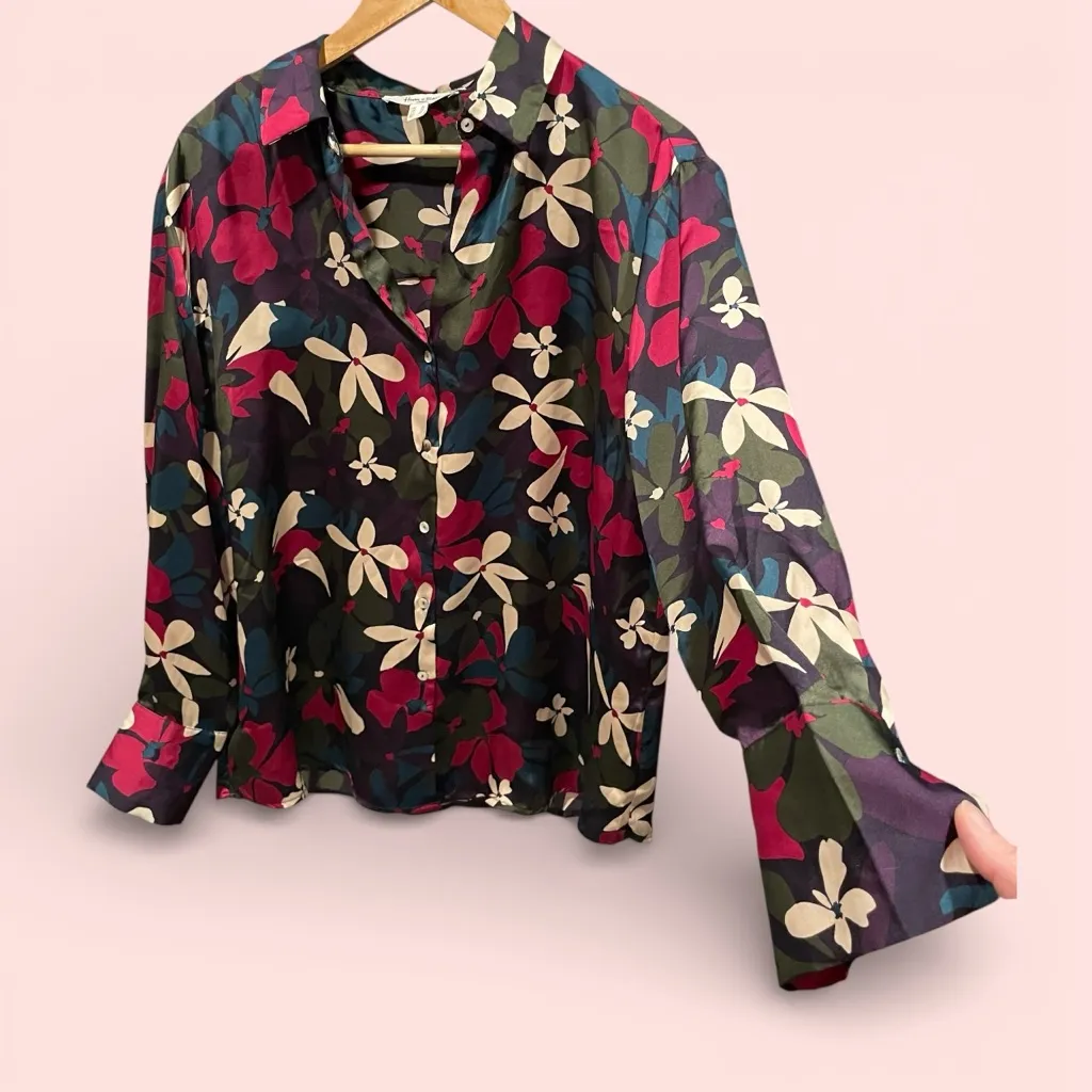 Beautiful silky olive plum plumeria floral button front blouse. GUC. Button front closure. Brand is Haver & Blair London. Size medium. Measurements taken laying flat are approximately: Pit to pit: 23” Length: 28” Sleeve: 23”