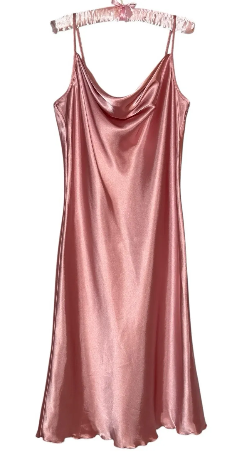 Bebe metallic dusty rose/pink satin slip dress featuring a sultry cowl neckline, adjustable spaghett... Show more